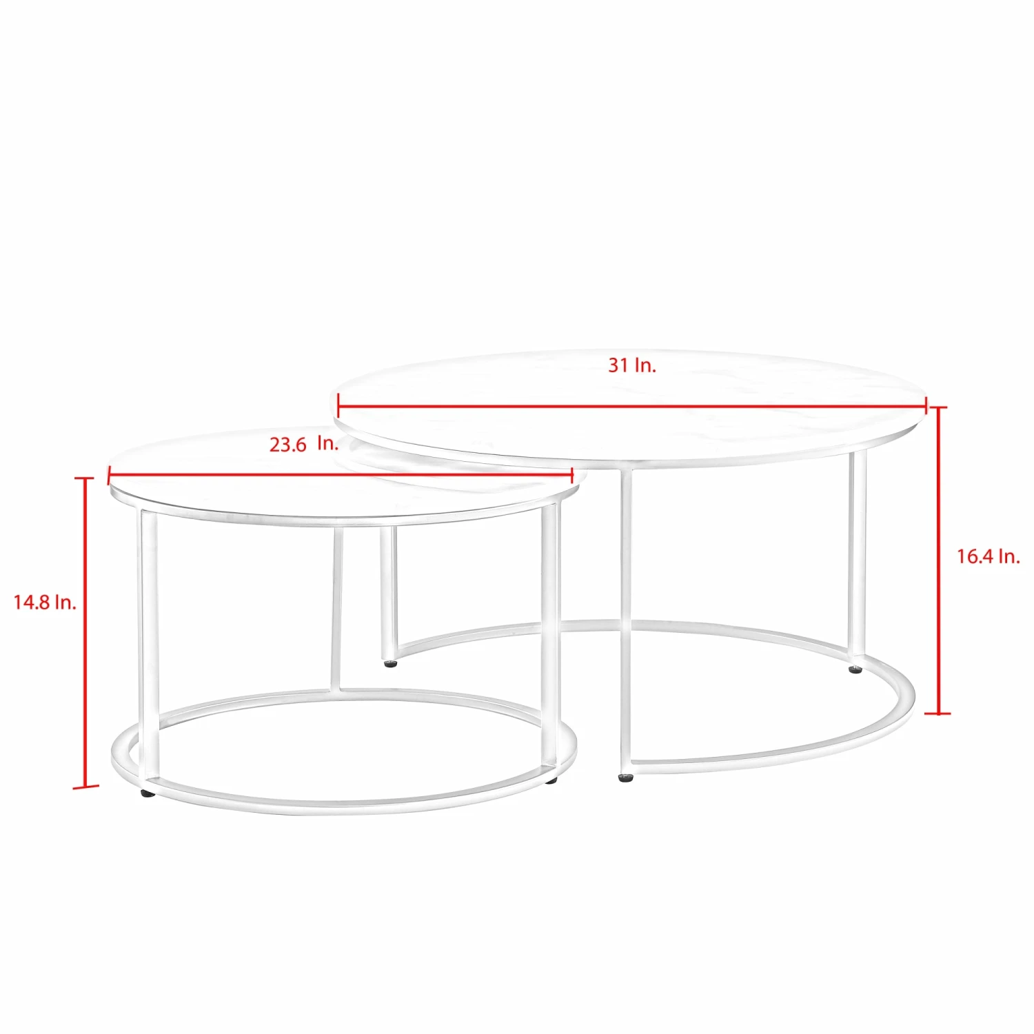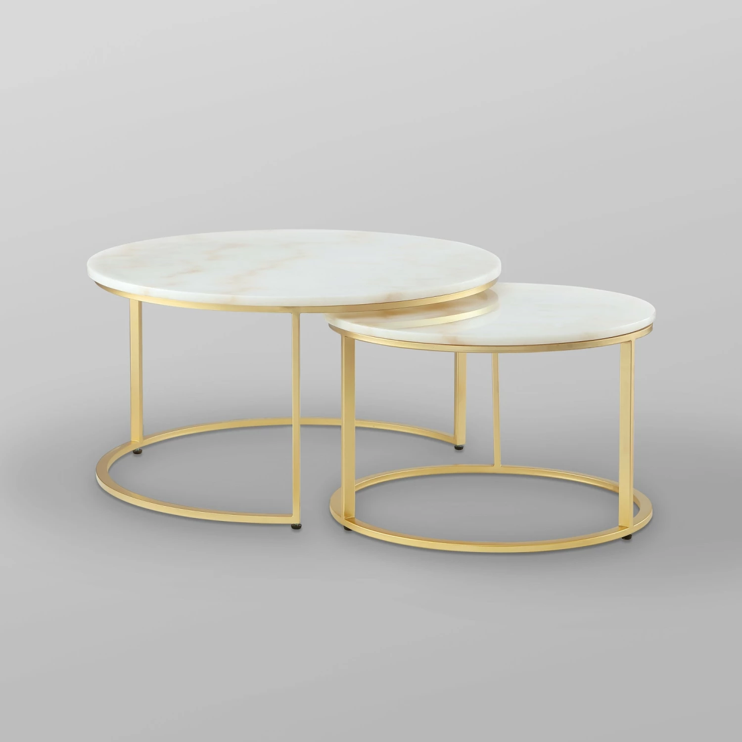 This modern coffee table in a set of 2 is designed with an elegant rounded metal frame and a genuine marble top that creates a welcoming feeling and provides ample space to put drinks or decor on top. Whether using it as the perfect perch for your remote control or morning mug it brings a sophisticated and luxurious look to any setting. Show off favorite decorative items, let them hold a warm cup of coffee while reading, or let it anchor a bold lamp and magazines next to a favorite chair. Perfect as an accent piece or centerpiece, bringing contemporary modern style into your home. This metal frame coffee table is a perfect complement to a variety of interior decor.