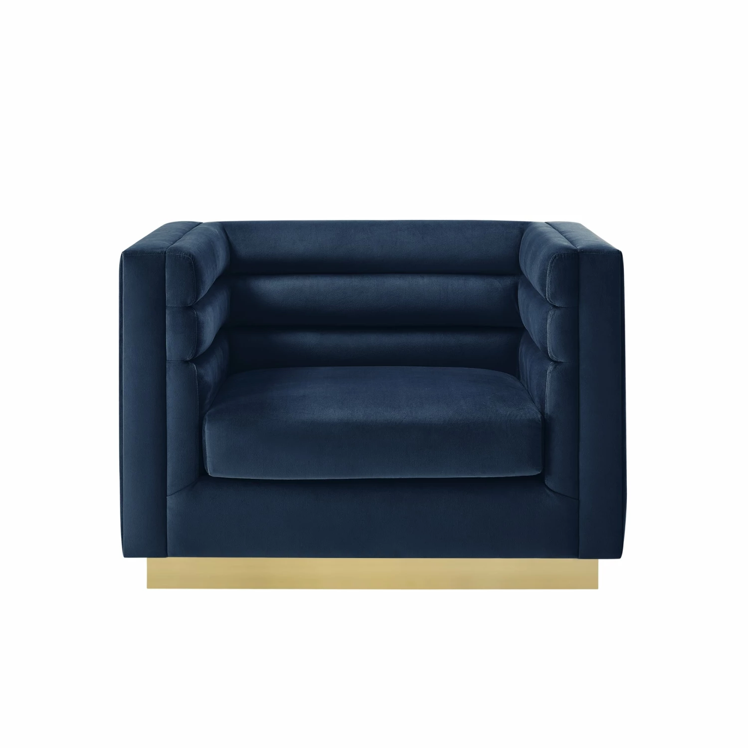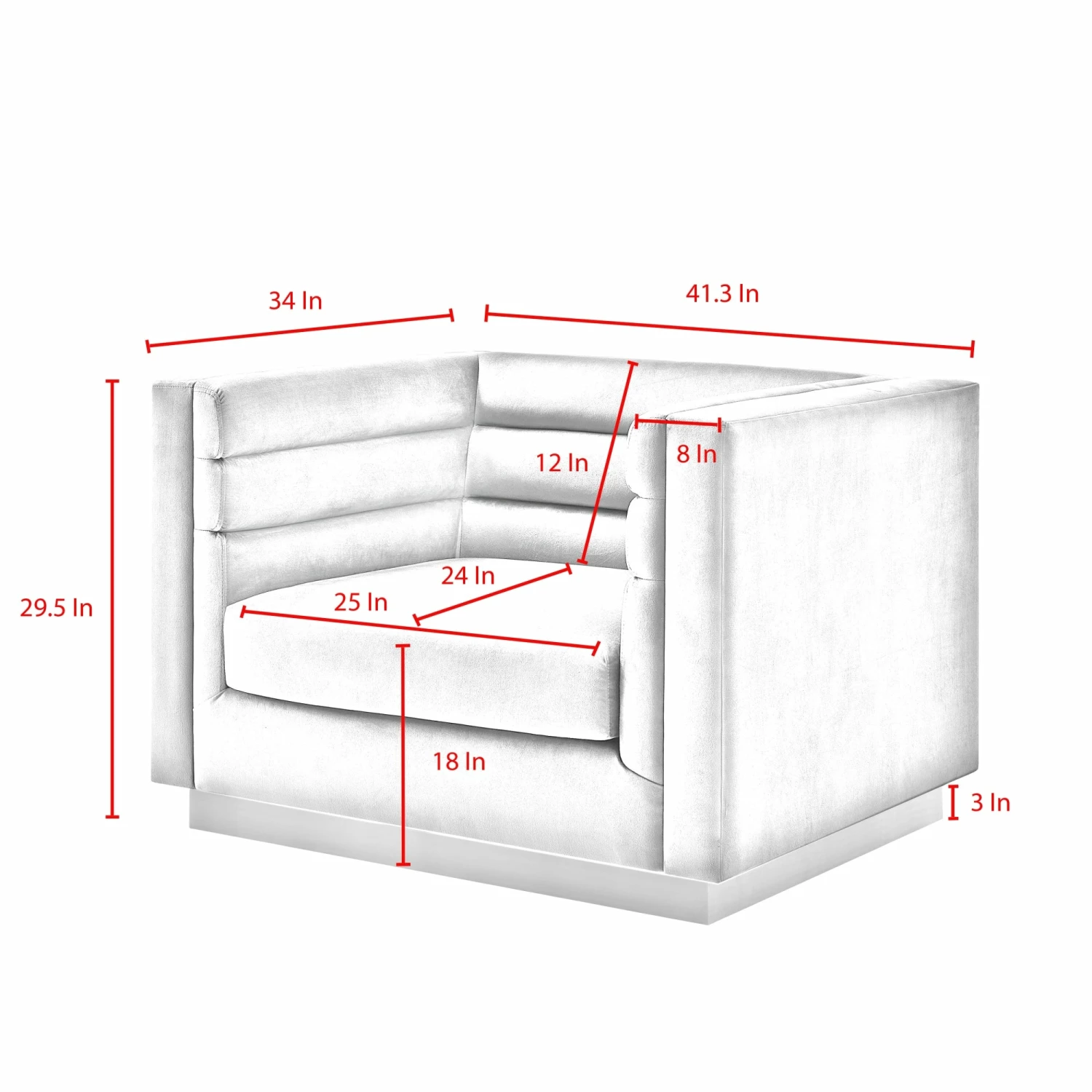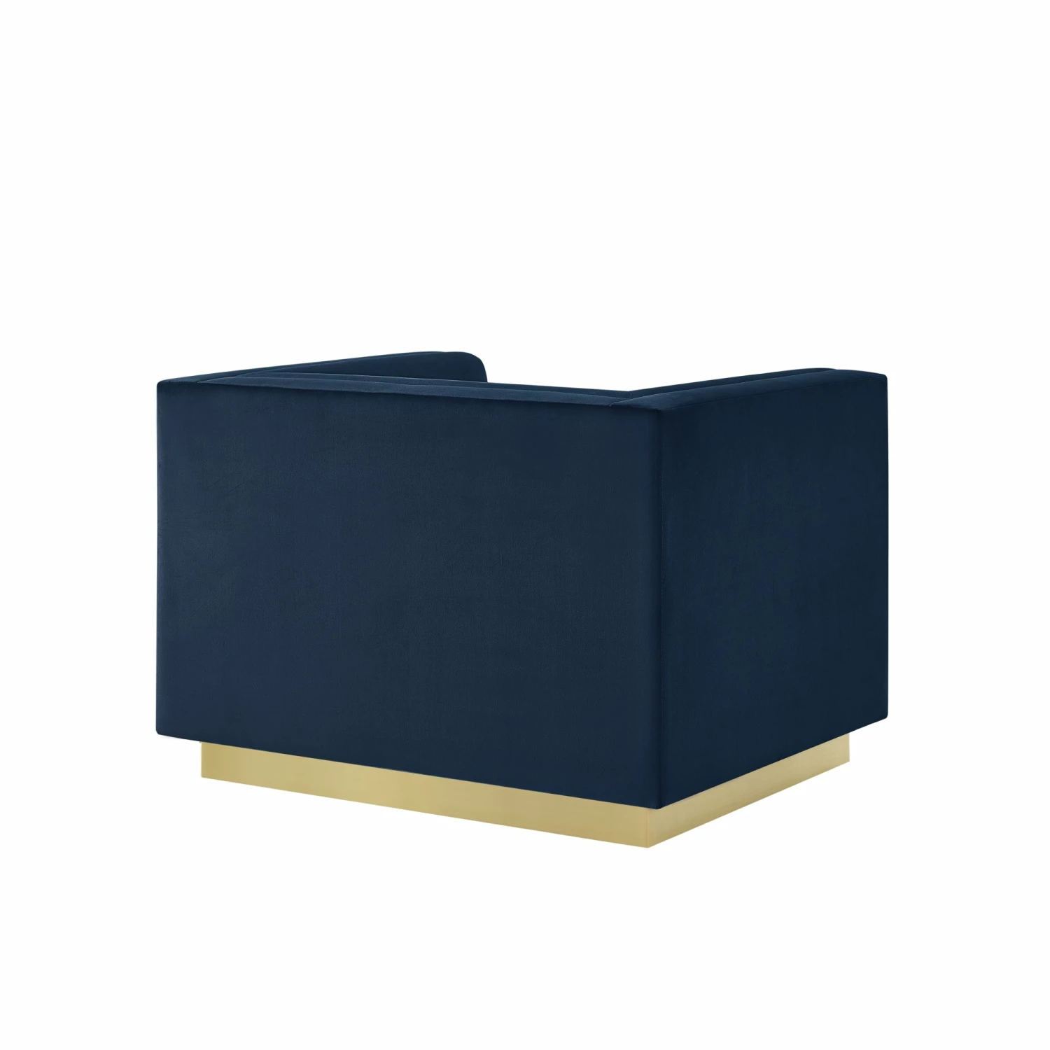 Our velvet club chair brings a soft refinement to the boundaries of your living room, bedroom or foyer. This simple yet attractive item provides a centerpiece color and design that blends easily with your main furniture to create a vibrant and warm indoor place to come home to. Straight lines, square arms, soft velvet handmade upholstery, cozy foam filling and a minimalist solid base with a gold or silver metal finish give this piece a unique modernist feel. You can use it as a lounge chair, accent chair, dressing chair or club chair. The frame is comprised of a combination of solid wood and MDF, which makes the structure sturdy and durable, and high-quality sinuous springs installed inside the piece guarantee you comfortable seating.