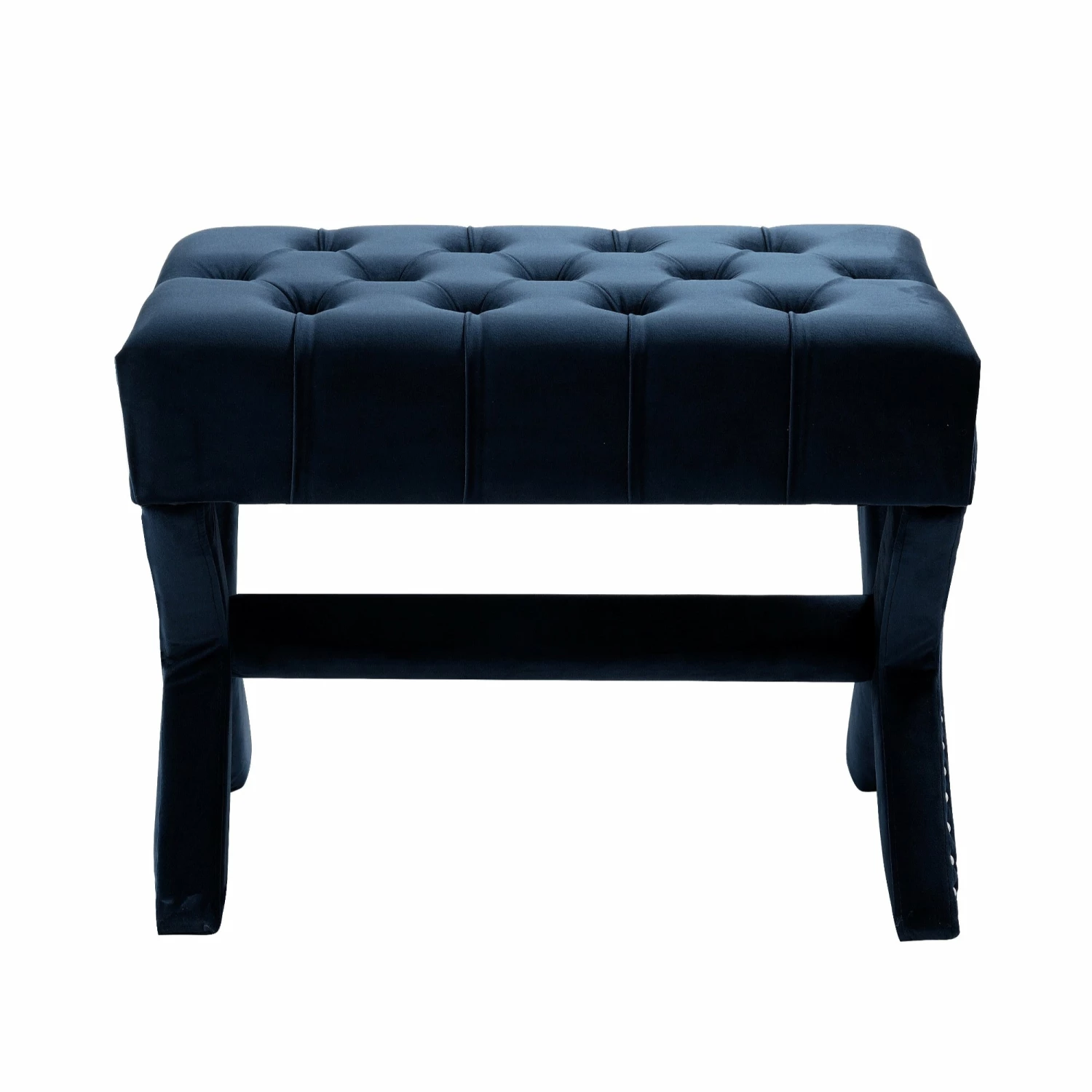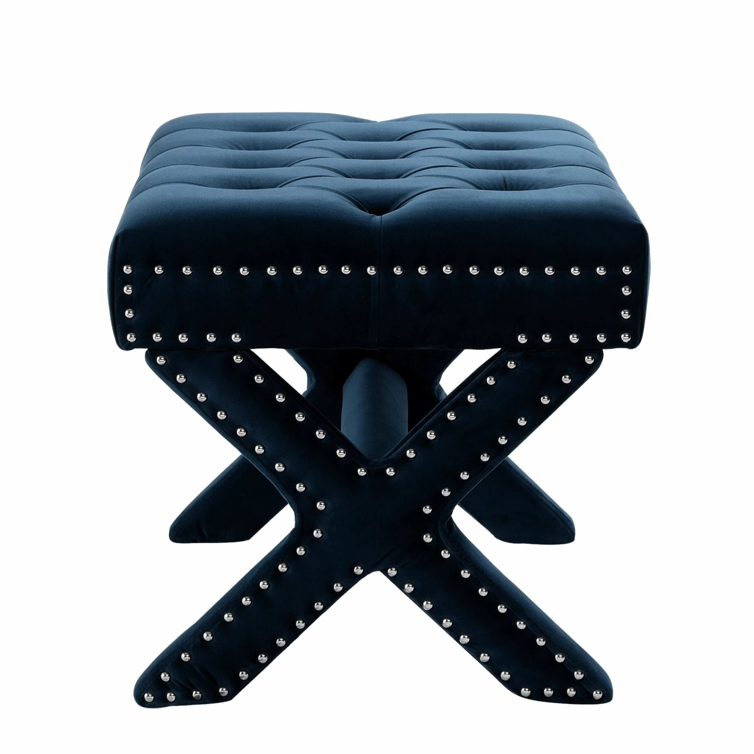 Our X-leg velvet ottoman adds a gentle sophistication in the confines of your living room, bedroom or entryway. Featuring a button tufted high density foam cushioned seat and silver decorative nail head trim with solid birch X-legs, this elegant accent piece provides both functionality and a focal point of color and style that seamlessly blend with your main furniture to create a dynamic and cozy interior space to come home to.
