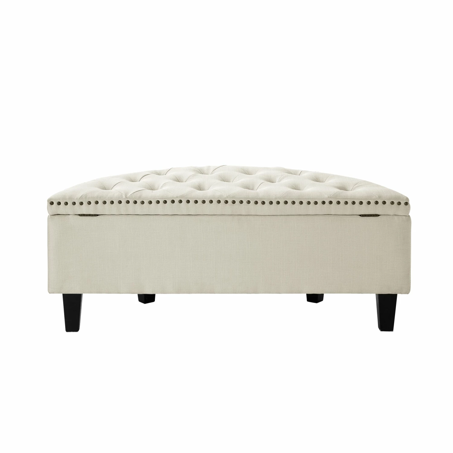 Our beautiful half-moon shape ottoman with a fashionable button tufting on top adds a contemporary yet reserved touch to your living room or bedroom. Featuring crisp linen fabric with contrasting goldtone nailhead trim this piece includes a lift top with safety hinges that opens to a spacious storage compartment. This space saving ottoman is the perfect height for a variety of uses and it features an exotic look that matches any style room to create an inviting and comfortable atmosphere to come home to.