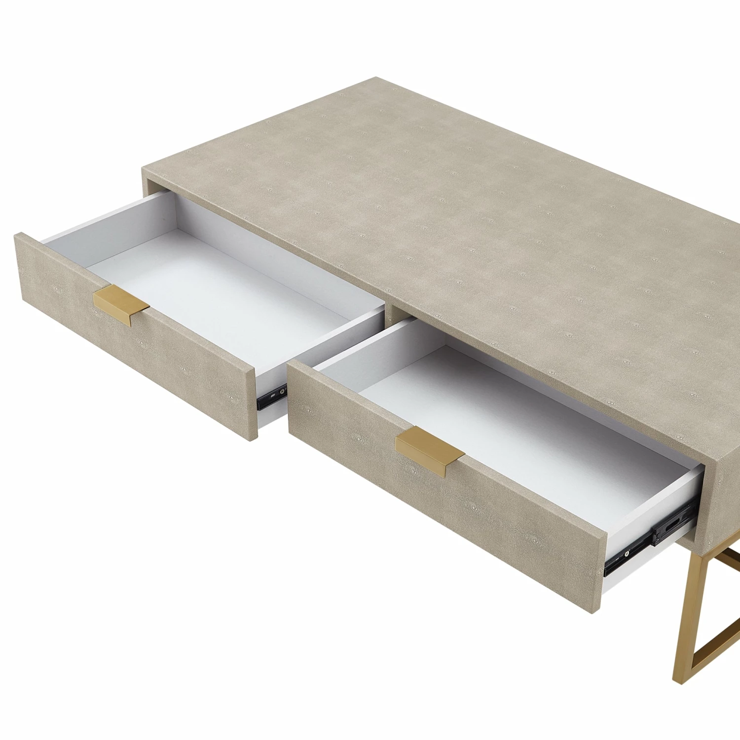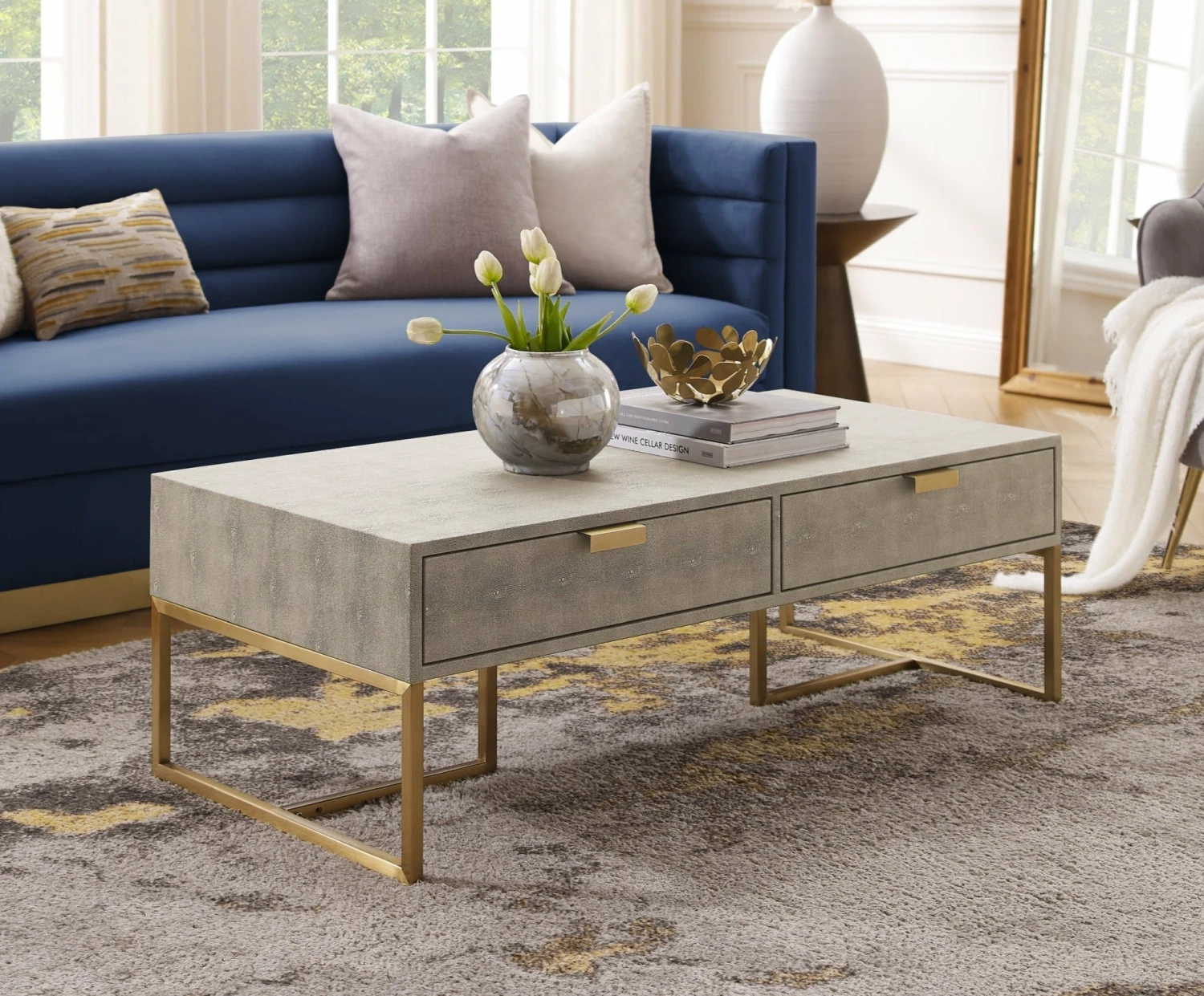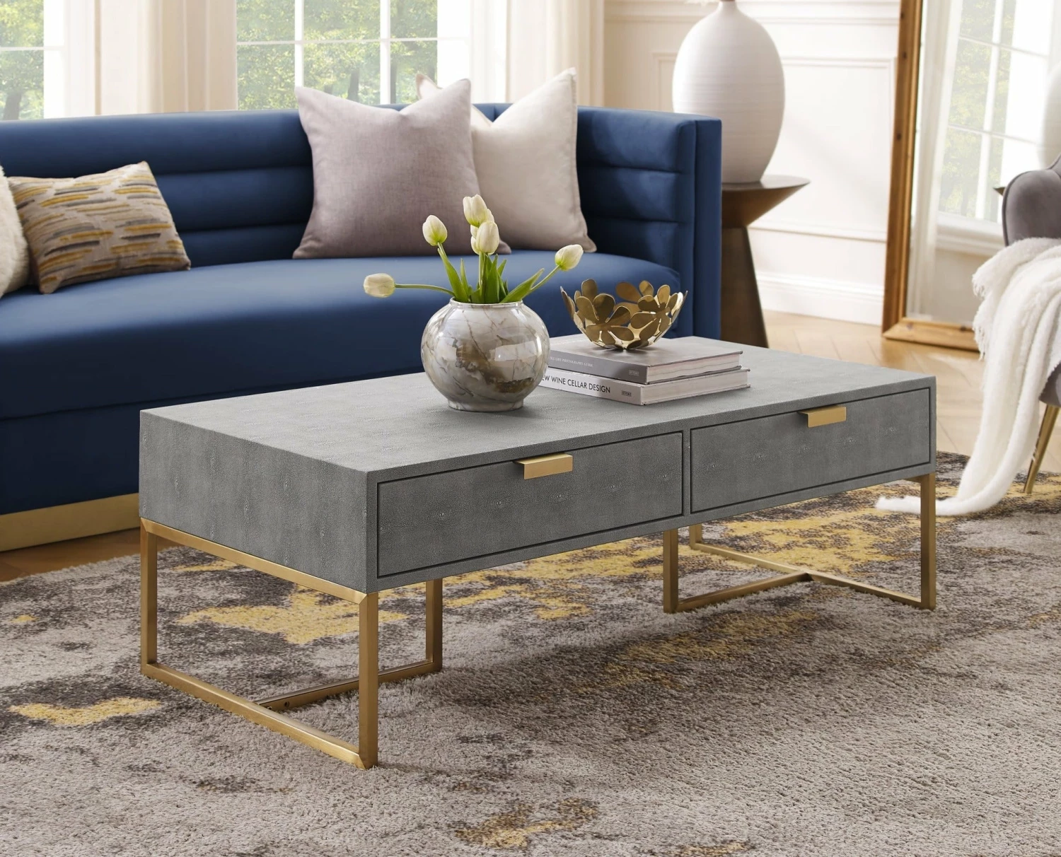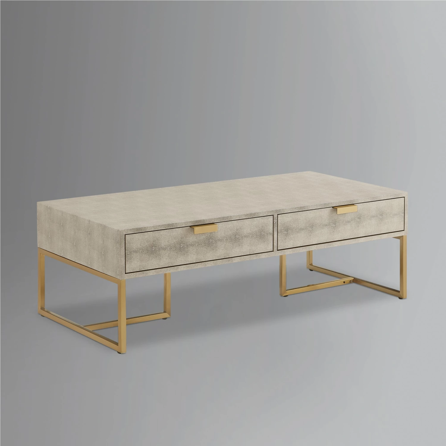 Lavish your home with this chic-inspired coffee table that instantly turns into a conversation piece with its classic but contemporary design. Boasting its exquisitely tailored shagreen texture, this coffee table is a unique addition to every modern home. This eye-catching piece of art decor is crafted from a high-quality MDF, stainless steel metal frame, topped with a luxurious faux shagreen fabric. Our modern coffee table also features 2 spacious drawers for organizing your living room essentials: remotes, magazines, newspapers, and more.