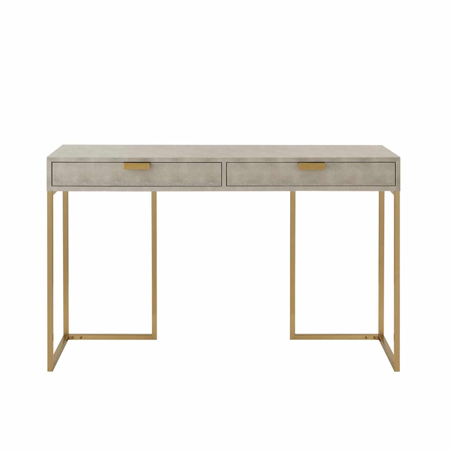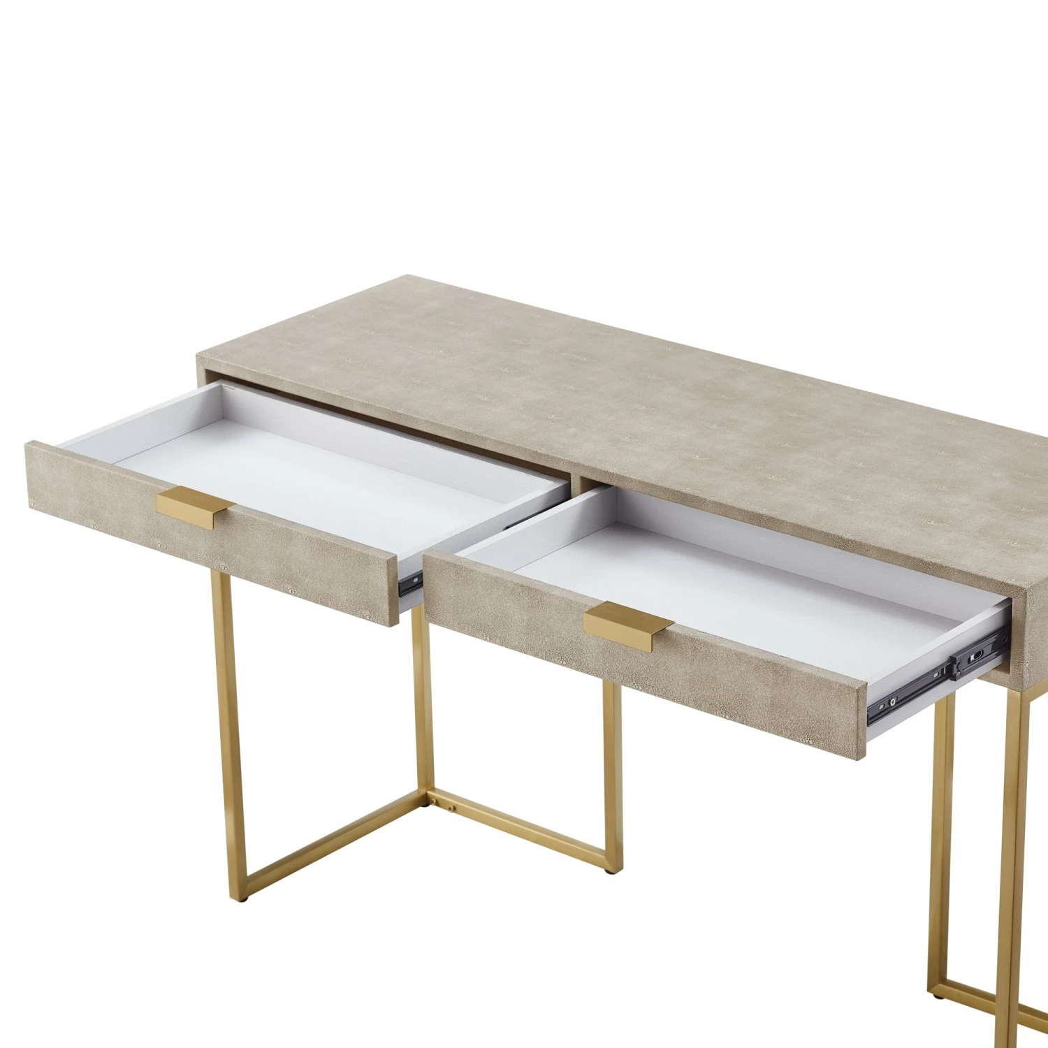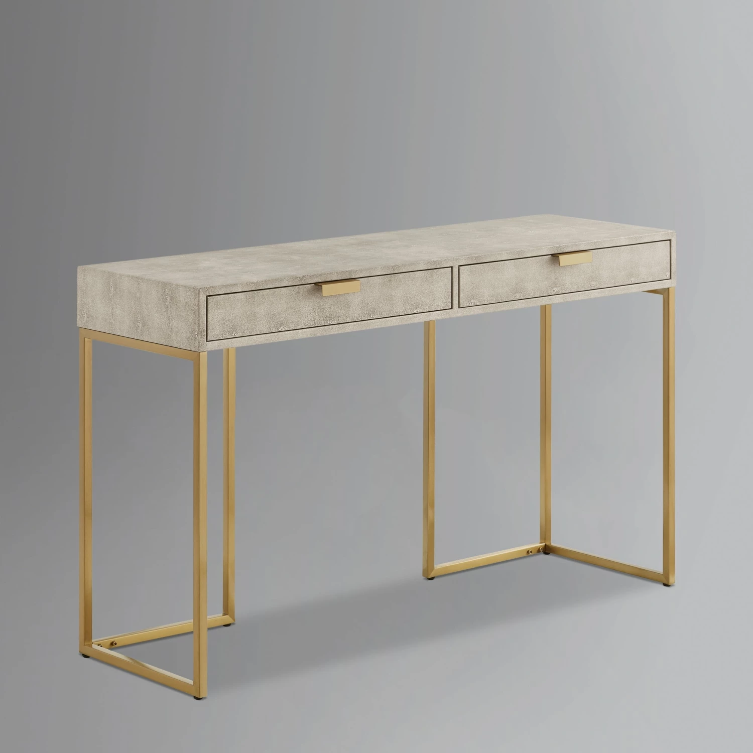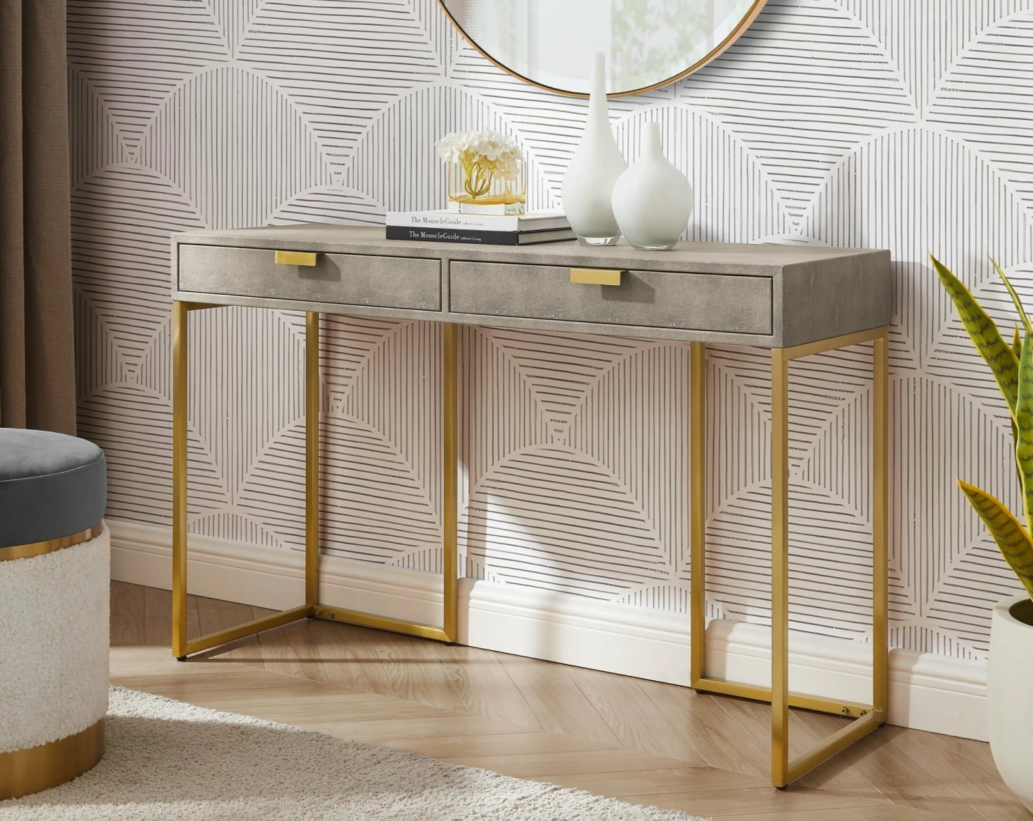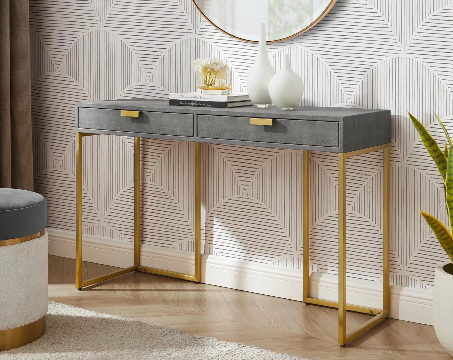 Add a modern flare to any room with this chic designer console table from our collection. See and feel the exquisitely tailored shagreen texture that instantly complements any home decor or design. Elegantly combined multi-purpose functionality of 2 spacious drawers and a luxurious brushed base and handles, this contemporary console table from our collection is the perfect addition to yours