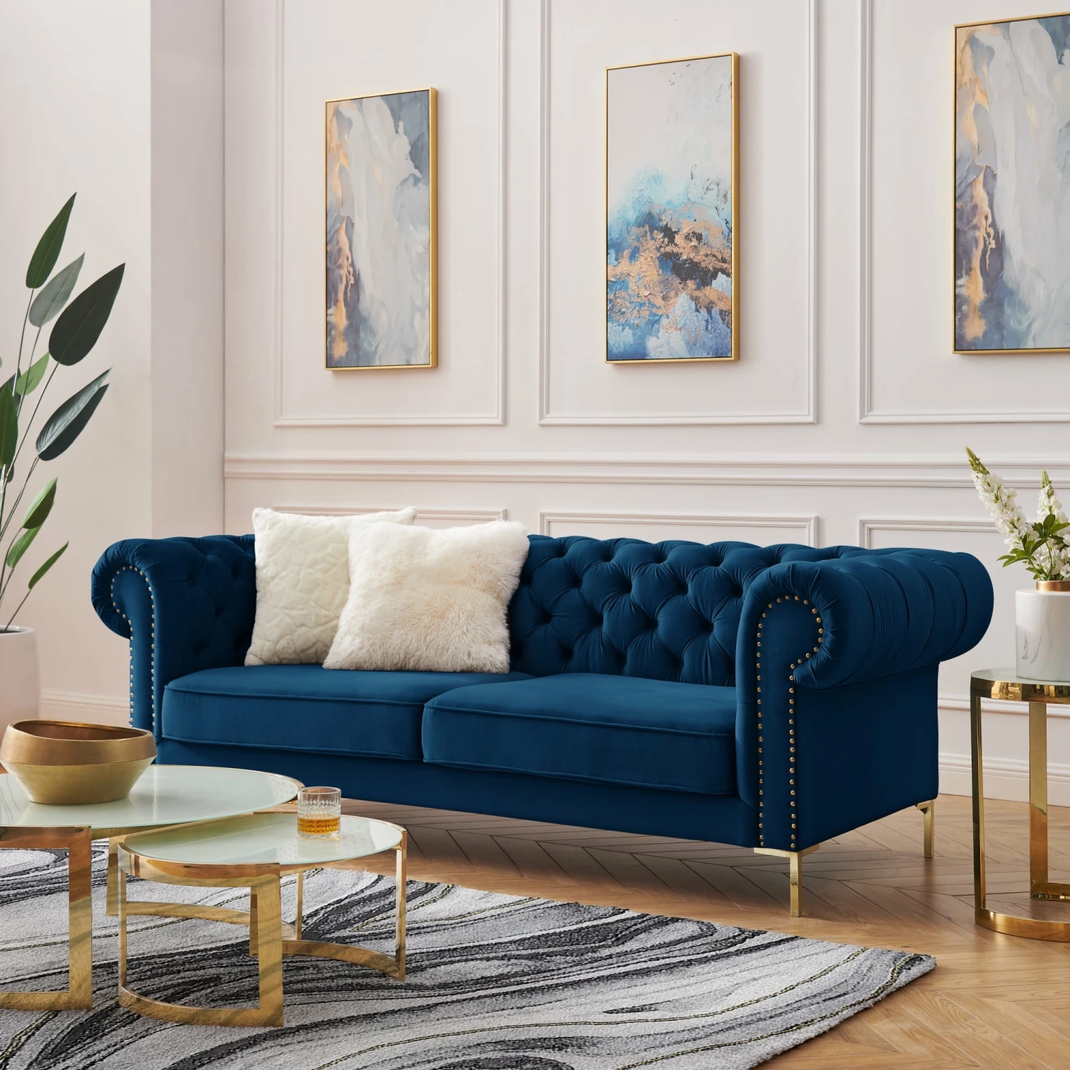 Our velvet chesterfield sofa has a classic design, perfect for rooms with a traditional appeal. This three-seat sofa is button tufted and has gold nailhead trim. Itβs a great addition to living rooms and offices, including a durable backrest and high-quality foam tufted in soft velvet. Furthermore, it is beautifully supported with Y-legs for the best stability, delivering a sleek appearance.